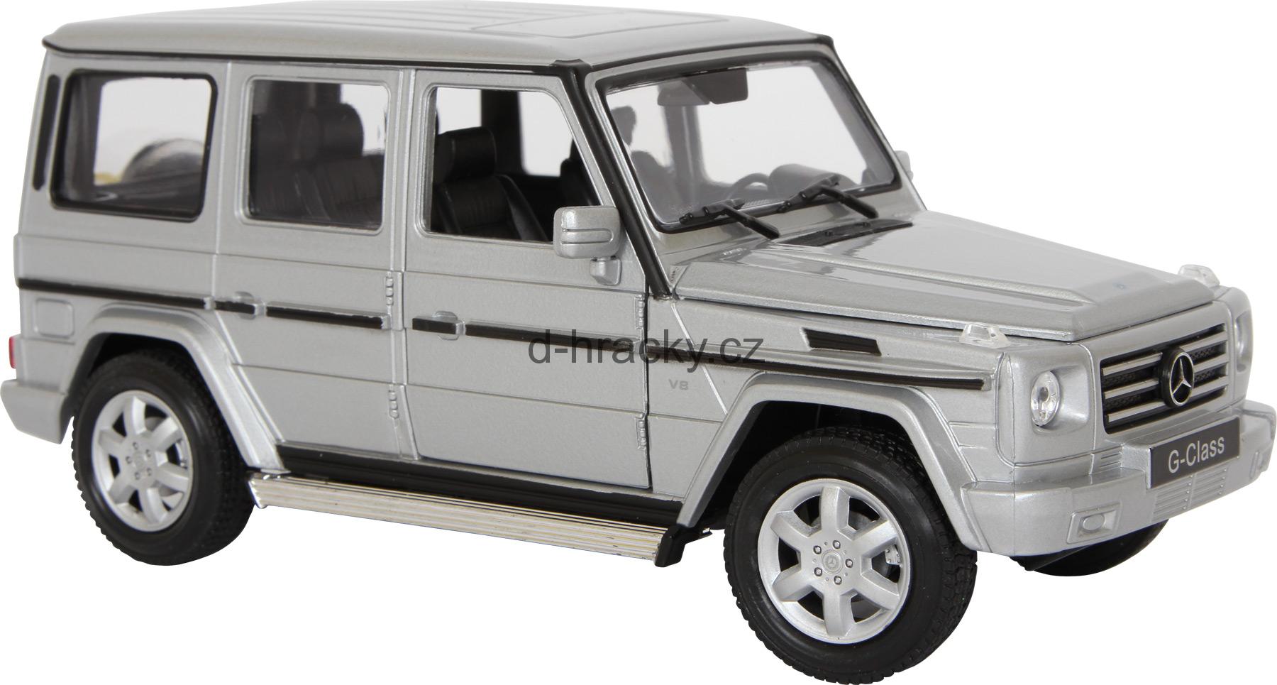 Robustní a výkonný G-Class Mercedes-Benz je krásnýoffroader. Do detailu propracovaný kovový model ve stříbrné barvě má otevírací boční dveře a přední kapotu. Přední kola reagují citlivě na pohyby volantu.