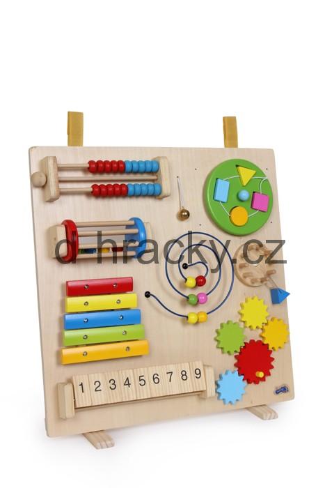Na této motorické desce lze hravým způsobem trénovat jemnou motoriku prstů pomocí 8 různých funkcí! Zde mohou nejmenší děti posouvat dřevěné perličky na počitadle, hrát jemné tóny na xylofonu, posouvat dřevěné perličky po kovové smyčce, zasouvat různé tvary do otáčivého disku nebo rozpohybovat 5 různě velkých ozubených kol. Kombinace robustní překližky a lakovaných dřevěných dílů stále znovu inspiruje nejmenší členy rodiny! Včetně stabilizačních otočných nohou a 2 suchých zipů k připevnění, např. na židli.