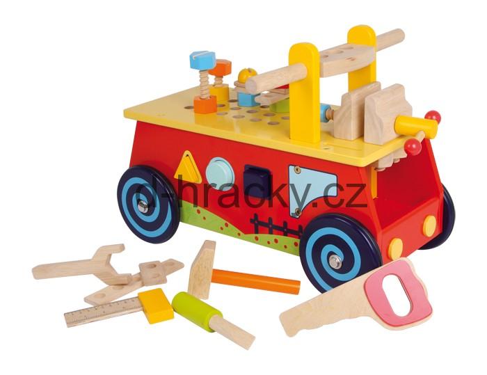 Ohromnou zábavu a motorické vzdělávání zaručuje tento neuvěřitelný vůz z barevně lakovaných, odolných MDF-desek, masivního dřeva a neošetřeného bukového dřeva! Geometrické tvary zastrčit a nasadit na správná místa nebo zkoušet první řemeslnické práce s nářadím - to vše si zde vyzkouší malé ručičky! Hladký a tichý chod vozíku zaručují gumové kroužky na kolech na kovových osách. Pod sedadlem se spoustou otvorů pro upevnění šroubů, matic a spojovacích destiček je také dostatečný skladovací prostor pro kladívko, pilku a šroubovák! Zlatý hřeb: svěrák s otočným vřetenem lze variabilně namontovat!